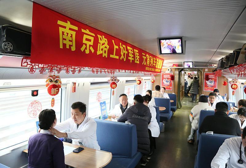 人民网上海2月12日电 2月12日,正值农历乙巳蛇年元宵节,在扬州东开往上海的G7285次列车上,海军军医大学第二附属医院(上海长征医院)11名专家走进列车餐车,临时搭设起一座特殊的“健康诊室”,为旅客开展义诊服务。